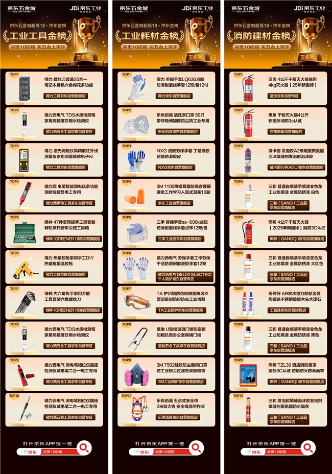 在4月17日晚8时开启的京东超级18活动上,京东金榜首次发布工业超级单品三大榜单,覆盖工业工具、工业耗材、消防建材三大核心品类,这是京东金榜首次将权威榜单体系拓展至五金工业品领域,为工业品采购提供标准化品质参考,也为行业优质品牌搭建增长阵地。