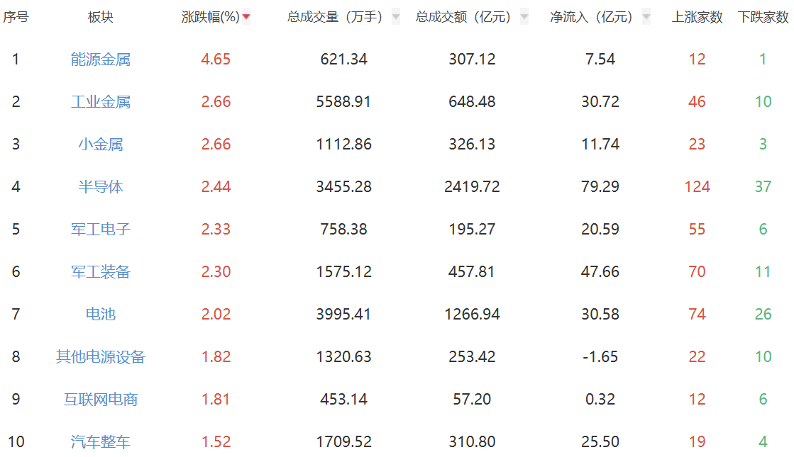 板块方面,能源金属、工业金属、半导体等板块涨幅居前,白酒、银行、保险等板块跌幅居前。