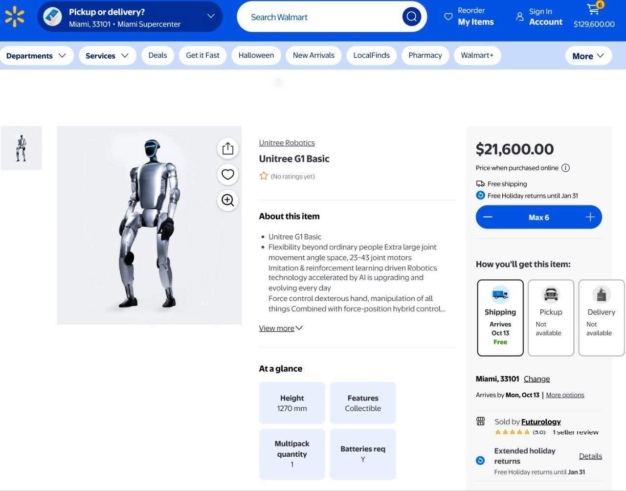 格隆汇10月9日|沃尔玛美国网站近日上架中国宇树G1人形机器人,基本款售价为21600美元,免费送货,一次可以订购六台。