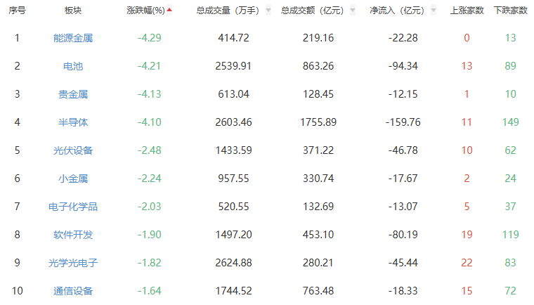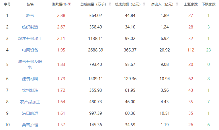 板块方面,燃气、纺织制造、煤炭开采加工等板块涨幅居前,能源金属、电池、贵金属等板块跌幅居前。
