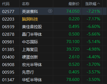 盘面上,作为市场风向标的大型科技股集体走低大市承压明显,其中,百度跌3.48%,阿里巴巴跌3.16%,小米、美团跌近3%,快手跌2.4%,网易、京东跌近2%,腾讯跌1.5%;半导体芯片股、苹果概念股、光伏股、汽车股、机器人概念股等热门板块齐挫,其中,丘钛科技跌超9%,鸿腾精密跌8.8%,协鑫科技跌6.5%,中芯国际跌超5%;昨日大幅上涨的教育股集体低迷,金价短线跳水跌破4280美元,黄金股度多数转跌,铜业股、铝业股跟跌。