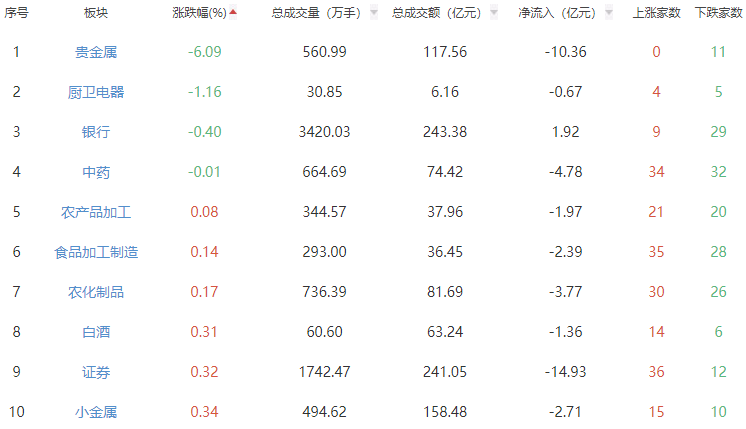 板块方面,煤炭开采加工、电机、电池等涨幅居前,贵金属、厨卫电器、银行等跌幅居前。