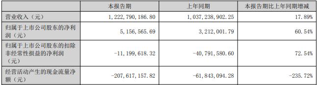 据公司2025年半年报,报告期内,公司实现营业收入12.23亿元,同比增长17.89%;归属于上市公司股东的净利润515.66万元,同比增长60.54%;扣除非经常性损益后的净利润-1119.96万元,上年同期-4079.16万元;经营活动产生的现金流量净额-2.08亿元,上年同期-6184.31万元。