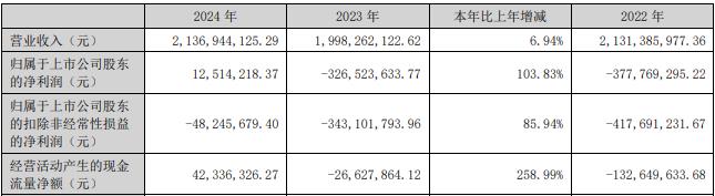 据公司2024年年报,报告期内,公司实现营业收入21.37亿元,同比增长6.94%;归属于上市公司股东的净利润1251.42万元,同比增长103.83%;归属于上市公司股东的扣非净利润为-4824.57万元,2023年为-3.43亿元,2022年为-4.18亿元;经营活动产生的现金流量净额为4233.63万元,同比增长258.99%。
