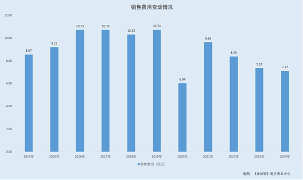 2014-2024年,养元饮品的销售费用分别为8.57亿元、9.21亿元、10.73亿元、10.73亿元、10.32亿元、10.74亿元、6.04亿元、9.64亿元、8.4亿元、7.37亿元、7.12亿元。