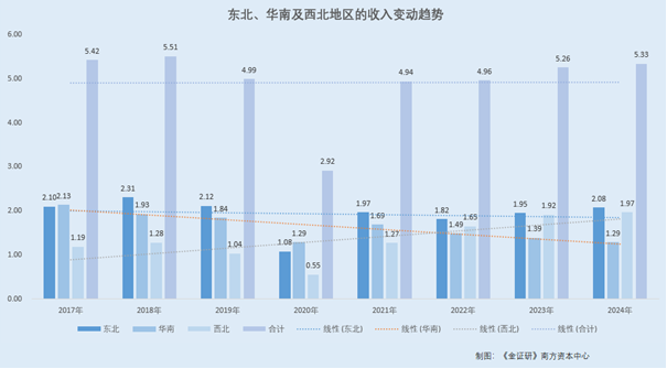 2017-2024年,养元饮品东北地区收入分别为2.1亿元、2.31亿元、2.12亿元、1.08亿元、1.97亿元、1.82亿元、1.95亿元、2.08亿元,华南地区收入分别为2.13亿元、1.93亿元、1.84亿元、1.29亿元、1.69亿元、1.49亿元、1.39亿元、1.29亿元,西北地区收入分别为1.19亿元、1.28亿元、1.04亿元、0.55亿元、1.27亿元、1.65亿元、1.92亿元、1.97亿元,前述三个地区收入合计分别为5.42亿元、5.51亿元、4.99亿元、2.92亿元、4.94亿元、4.96亿元、5.26亿元、5.33亿元,占营业收入比例分别为7.01%、6.77%、6.69%、6.6%、7.15%、8.38%、8.53%、8.81%。