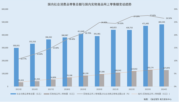 综上所述,从2015年到2024年,国内互联网上网人数6.88亿人提升至11.08亿人,互联网普及率由50.3%提升至78.6%。在此期间,国内网上零售额、实物商品网上零售额呈快速增长态势,国内实物商品网上零售额占社会消费品零售总额比重也已由一成增至超两成。