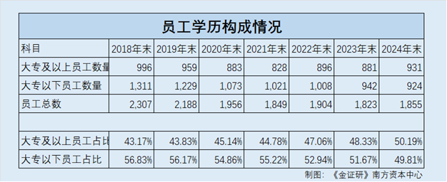 即2017年,养元饮品披露其学历本科及以上员工数量占比不足两成,大专以下学历员工占比超五成。2017年起,养元饮品不再披露本科及以上员工数量占比,但截至2023年末其大专以下学历员工占比均超五成,2024年占比变为49.81%。