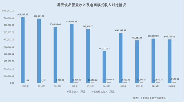 不难看出,2015年,养元饮品开始布局电商渠道。2018年,养元饮品电商销售收入突破亿元。而截至2024年,养元饮品电商收入仅1.95亿元,营收占比不足4%。