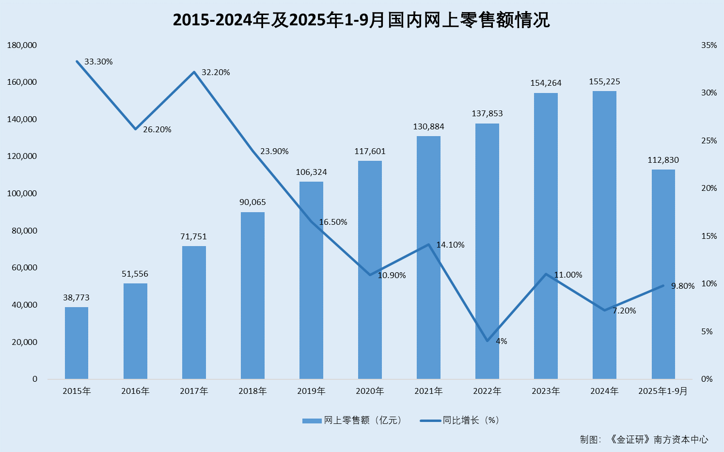 2015-2024年及2025年1-9月,国内网上零售额分别为38,773亿元、51,556亿元、71,751亿元、90,065亿元、106,324亿元、117,601亿元、130,884亿元、137,853亿元、154,264亿元、152,287亿元、112,830亿元,分别同比增长33.3%、26.2%、32.2%、23.9%、16.5%、10.9%、14.1%、4%、11%、7.2%、9.8%。
