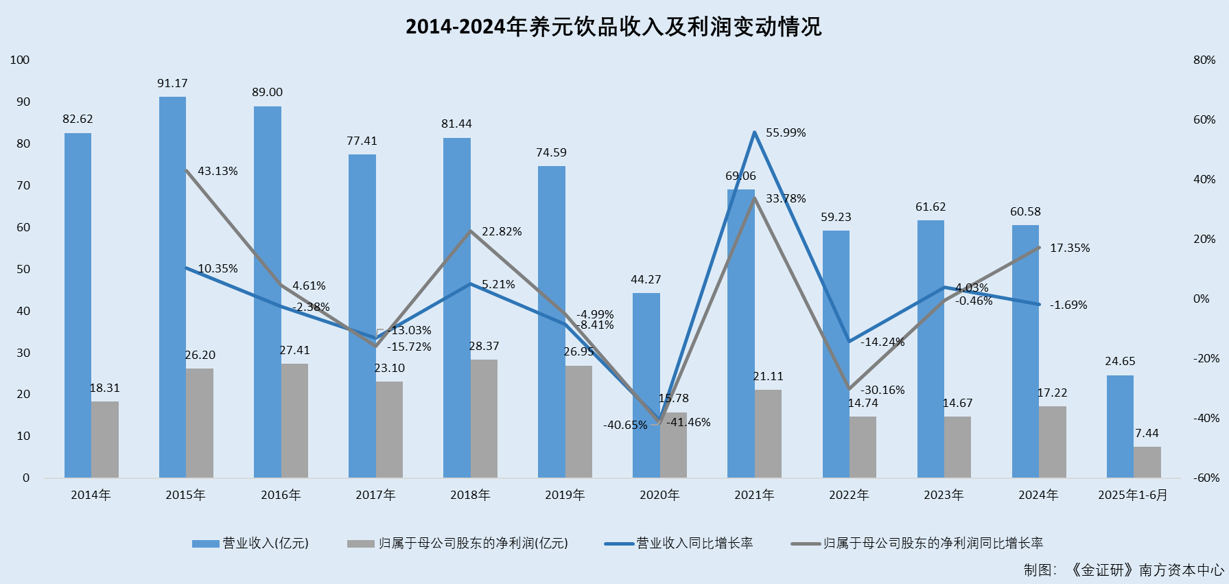 2025年上半年,养元饮品的营业收入、归母净利润分别为24.65亿元、7.44亿元,相较于上一年同期分别减少16.19%、27.76%。