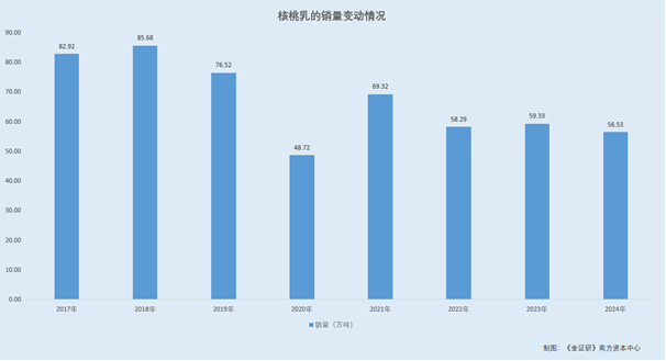 2017-2024年,养元饮品的核桃乳的销量分别为82.92万吨、85.68万吨、76.52万吨、48.72万吨、69.32万吨、58.29万吨、59.33万吨、56.53万吨。