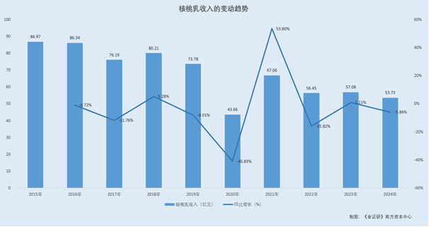 1.2 多年来核桃乳贡献超九成收入而2024年收入占比不足九成,且核桃乳销售收入较十年前已缩水超三成
