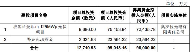 公司本次向特定对象发行股票拟募集资金总额不超过96,000.00万元(含本数),扣除发行费用后的募集资金净额将用于 波黑科曼耶山125MWp光伏项目、补充流动资金。