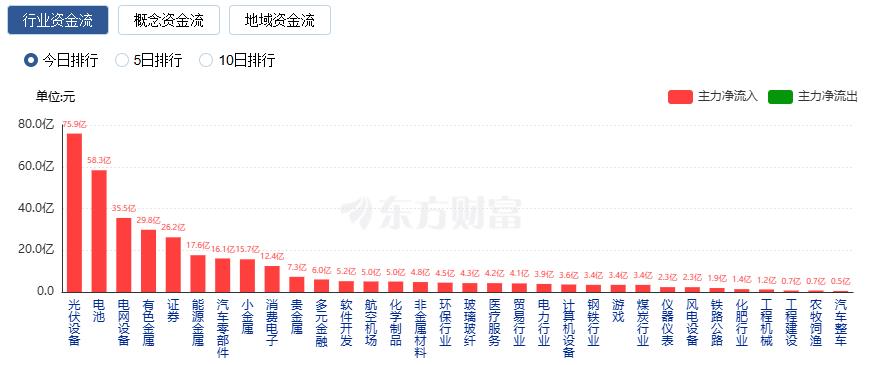 行业资金方面,截至收盘,光伏设备、电池、电网设备等净流入排名靠前,其中光伏设备净流入75.89亿。