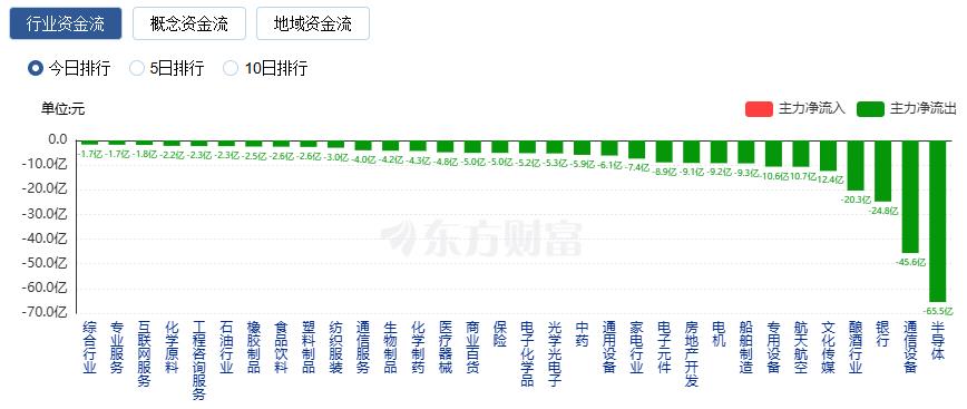 净流出方面,半导体、通信设备、银行等净流出排名靠前,其中半导体净流出65.50亿元。