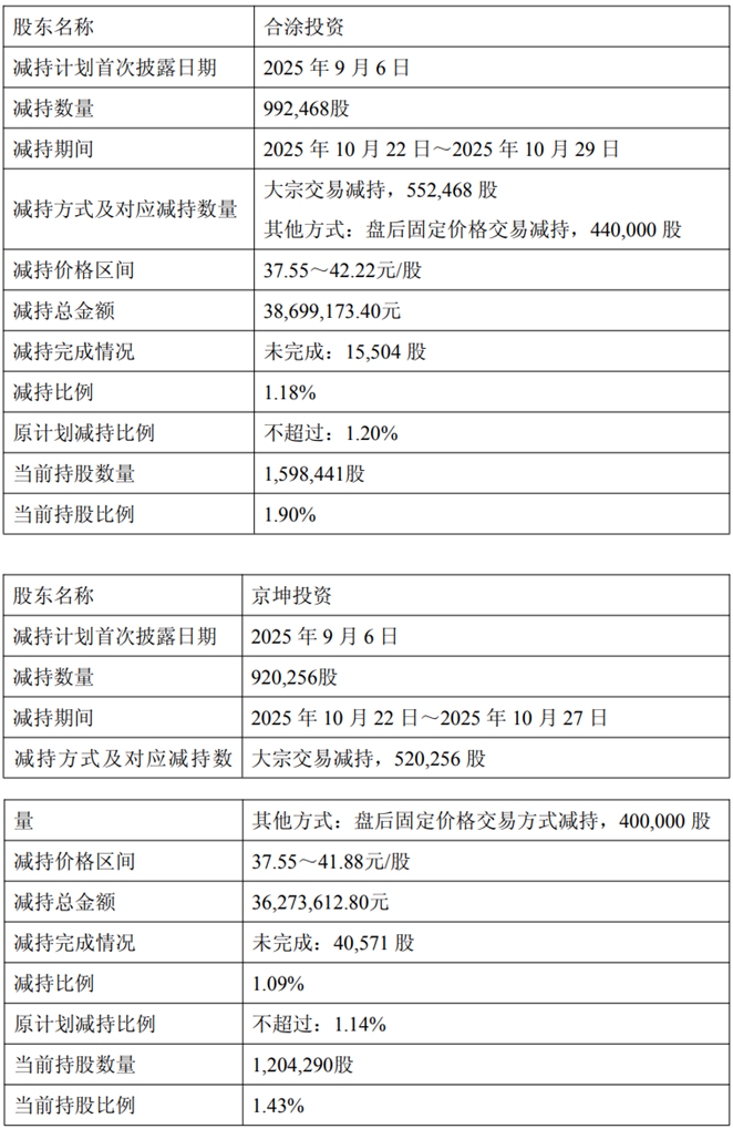 近日,公司收到上述股东出具的《关于股份减持计划实施结果告知函》,截至2025年10月29日收盘,合涂投资通过盘后固定价格交易及大宗交易方式累计减持股份992,468股,占公司总股本的1.18%,其中通过盘后固定价格交易方式减持股份440,000股,通过大宗交易方式减持股份552,468股;京坤投资通过盘后固定价格交易及大宗交易方式累计减持股份920,256股,占公司总股本的1.09%,其中通过盘后固定价格交易方式减持股份400,000股,通过大宗交易方式减持股份520,256股。合涂投资、京坤投资本次减持计划已实施完毕。