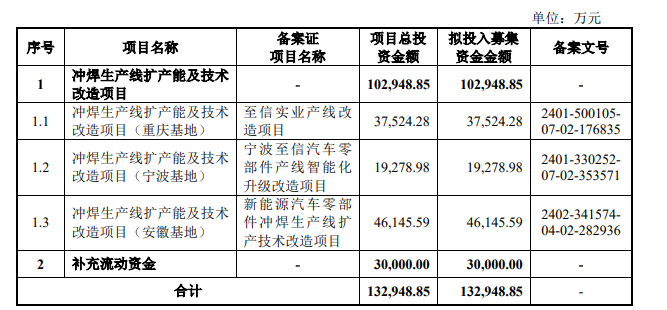 招股书显示,至信股份拟在上交所主板上市,募集资金132,948.85万元,用于冲焊生产线扩产能及技术改造项目、补充流动资金。