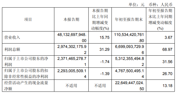 2025年前三季度,公司实现营业收入1105.34亿元,同比增长3.67%;归属于上市公司股东的净利润53.12亿元,同比增长31.56%;归属于上市公司股东的扣除非经常性损益的净利润47.68亿元,同比增长26.70%;经营活动产生的现金流量净额为226.49亿元。