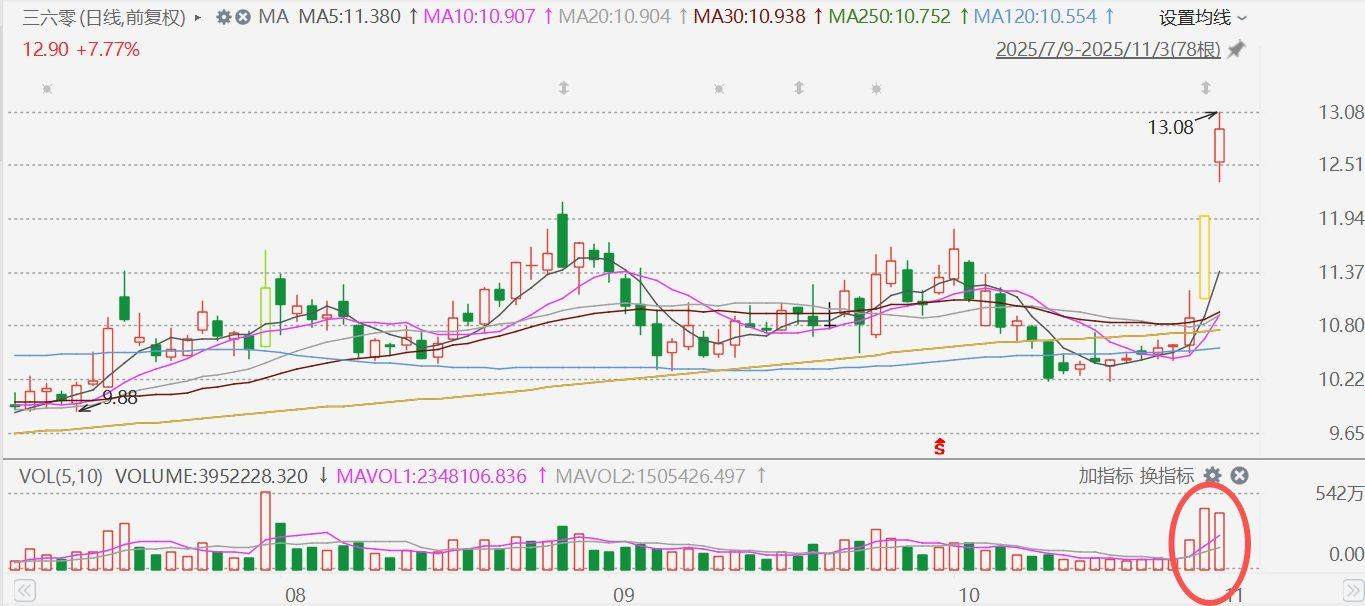 格隆汇11月3日|继上周五涨停后,三六零(601360)(601360.SH)今日盘中再度拉升,涨超9%,逼近涨停报13.08元,股价创2月14日以来新高。从三六零近期走势来看,该股已连续11日上涨,且在最近三个交易日涨幅扩大的同时,成交额也明显放大。
