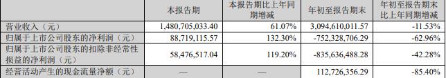 年初至报告期末,公司实现营业收入30.95亿元,同比减少11.53%;归属于上市公司股东的净利润-7.52亿元;扣除非经常性损益后的净利润-8.36亿元;经营活动产生的现金流量净额1.13亿元。