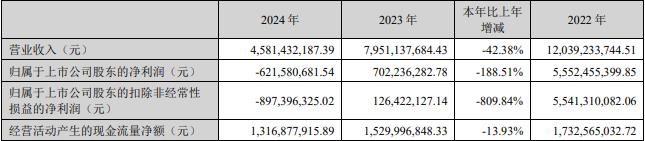 据公司2024年年报,报告期内,公司营业收入为45.81亿元,同比下降42.38%;归属于上市公司股东的净利润-6.22亿元;归属于上市公司股东的扣除非经常性损益的净利润-8.97亿元;经营活动产生的现金流量净额13.17亿元,同比下降13.93%。