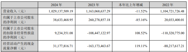 2024年,东土科技实现营业收入10.29亿元,同比下降11.52%;归属于上市公司股东的净利润0.39亿元,同比下降85.16%;归属于上市公司股东的扣除非经常性损益的净利润0.01亿元,上年同期为-1.08亿元;经营活动产生的现金流量净额0.31亿元,上年同期为-1.63亿元。