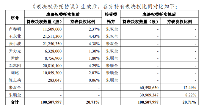 《表决权委托协议》生效后,朱双全、朱顺全持有上市公司的表决权比例为20.71%。截至2025年10月30日,朱梦茜直接持有上市公司的股权比例为4.92%。2025年10月30日,朱双全、朱顺全、朱梦茜签署《一致行动协议》(以下简称“《一致行动协议二》”),朱双全、朱顺全、朱梦茜为一致行动人,合计持有上市公司的表决权比例为25.63%,上市公司实际控制人变更为朱双全、朱顺全及朱梦茜。
