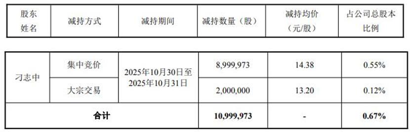 根据公告,2025年10月30日至2025年10月31日,刁志中减持数量为10,999,973股。其中通过集中竞价减持均价为14.38元/股,减持数量8,999,973股;大宗交易减持均价13.20元/股,减持数量2,000,000股。据计算,刁志中减持金额共计为1.56亿元。