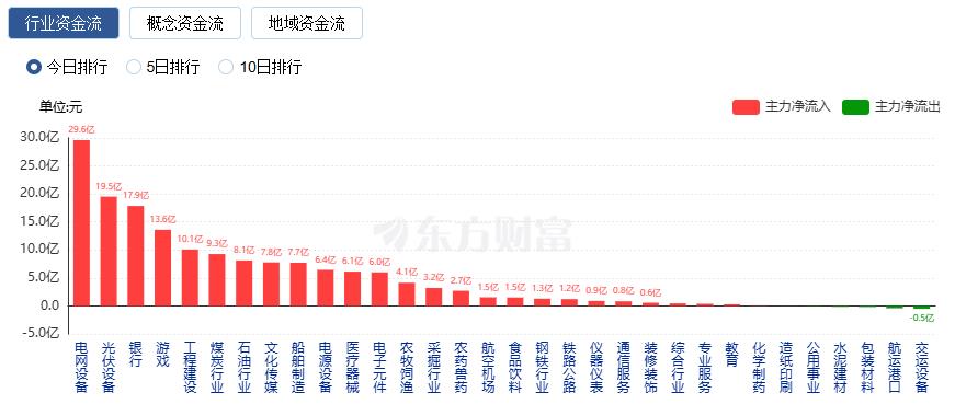 行业资金方面,截至收盘,电网设备、光伏设备、银行等净流入排名靠前,其中电网设备净流入29.62亿。