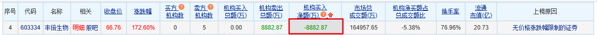 龙虎榜数据显示,卖出丰倍生物金额最大的前五名中,全部为机构专用席位。经统计,机构席位今日卖出丰倍生物净额为8882.87万元。