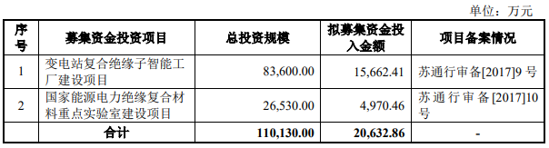 神马电力首次公开发行募集资金总额237,864,270.60元,扣除发行费用后,募集资金净额为206,328,638.59元。2019年7月2日,神马电力首次公开发行股票招股说明书显示,公司拟募集资金20,632.86万元,用于变电站复合绝缘子智能工厂建设项目、国家能源电力绝缘复合材料重点实验室建设项目。