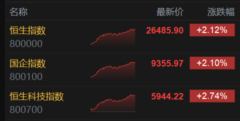 格隆汇11月6日|港股三大指数呈现高开高走行情,市场做多情绪回稳,一举收复月内全部跌幅。截止收盘,恒生科技指数尾盘一度涨至3%,最终收涨2.74%,恒生指数、国企指数分别上涨2.12%及2.1%,恒指上扬达550点报26485点。