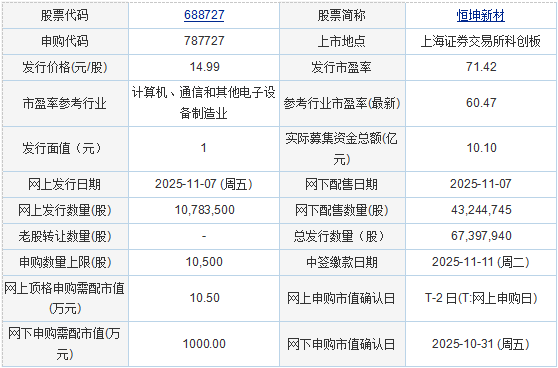 恒坤新材2025年11月6日披露的首次公开发行股票并在科创板上市发行公告显示,公司本次募投项目预计使用募集资金金额为100,669.50万元。按本次发行价格14.99元/股和6,739.7940万股的新股发行数量计算,若本次发行成功,预计公司募集资金总额101,029.51万元,扣除约11,856.05万元(不含增值税)的发行费用后,预计募集资金净额89,173.46万元(如有尾数差异,为四舍五入所致)。