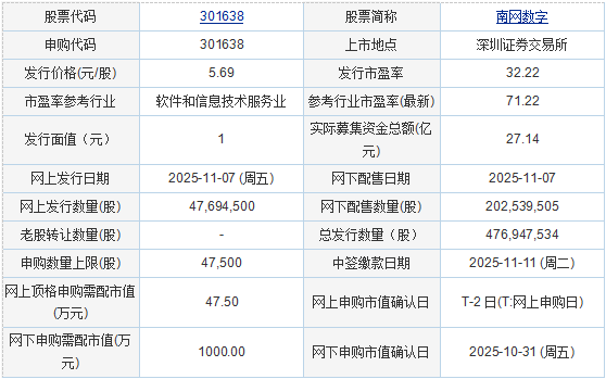 南网数字2025年11月6日披露的首次公开发行股票并在创业板上市发行公告显示,按本次发行价格5.69元/股计算,公司募集资金总额约为271,383.15万元,扣除预计发行费用约7,541.73万元(不含增值税)后,预计募集资金净额约为263,841.41万元,如存在尾数差异,为四舍五入造成。