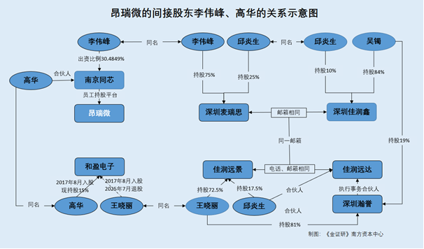 即在高华、李伟峰作为外部投资人,一同入股昂瑞微员工持股平台南京同芯。这背后,深圳麦瑞思控股股东李伟峰、和盈电子股东高华,又恰好与名为王晓丽的人员存在交集。
