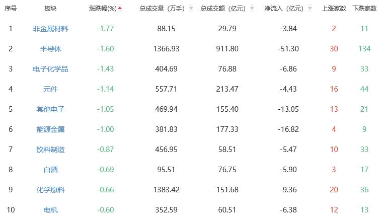 板块方面,医药商业、燃气、厨卫电器、港口航运等涨幅居前,非金属材料、半导体、电子化学品、元件等跌幅居前。