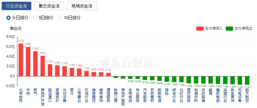 行业资金方面,截至收盘,化学制药、中药、燃气等净流入排名靠前,其中化学制药净流入6.65亿。