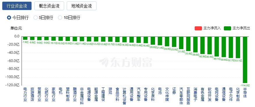 净流出方面,半导体、化学制品、电子元件等净流出排名靠前,其中半导体净流出114.2亿元。