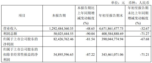 2025年前三季度,公司营业收入46.72亿元,同比减少32.67%;归属于上市公司股东的净利润3.90亿元,同比减少67.68%;归属于上市公司股东的扣除非经常性损益的净利润3.43亿元,同比减少71.21%;经营活动产生的现金流量净额5.49亿元,同比增长48.83%。
