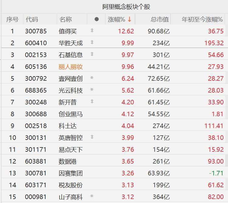 格隆汇11月18日|A股市场阿里巴巴概念股走强,其中,值得买涨超12%,华胜天成、石基信息、丽人丽妆涨停,壹网壹创涨超6%,光云科技涨超5%,新开普、创业黑马、科士达涨超4%,英唐智控、易点天下、数据港、因赛集团、税友股份、山子高科涨超3%。
