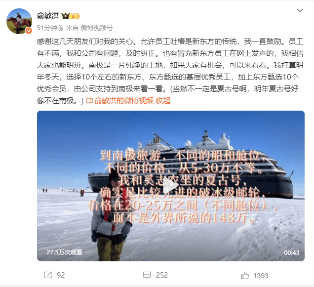 他还透露,打算明年冬天,选择10个左右的新东方、东方甄选的基层优秀员工,加上东方甄选10个优秀会员,由公司支持到南极来看一看。