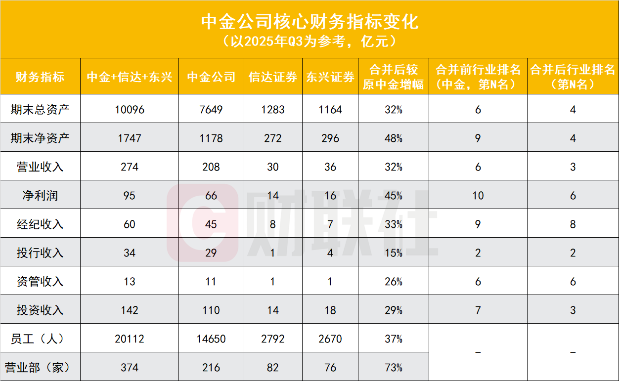 营业收入与利润端同样扩容明显。合并后营业收入合计274亿元,较原中金208亿元增长32%,行业排名从第6位升至第3位;净利润95亿元,较原中金公司66亿元增长45%,行业排名从第10位升至第6位。