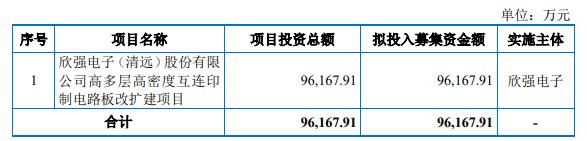 欣强电子原拟公开发行新股不低于5,100.00万股,原拟募集资金96,167.91万元,用于欣强电子(清远)股份有限公司高多层高密度互连印制电路板改扩建项目、