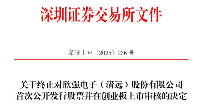 中国经济网北京11月30日讯 11月28日,深交所发布关于终止对欣强电子(清远)股份有限公司(简称“欣强电子”)首次公开发行股票并在创业板上市审核的决定。