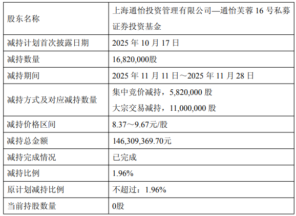 2025年11月28日,公司收到股东通怡芙蓉16号发来的《减持结果告知函》。上海通怡投资管理有限公司—通怡芙蓉16号私募证券投资基金(以下简称“通怡芙蓉16号”)于2025年11月11日至2025年11月28日期间通过集中竞价方式减持公司股份5,820,000股,通过大宗交易方式减持公司股份11,000,000股,合计减持公司股份16,820,000股,占公司总股本的比例为1.96%,本次减持计划已实施完毕。