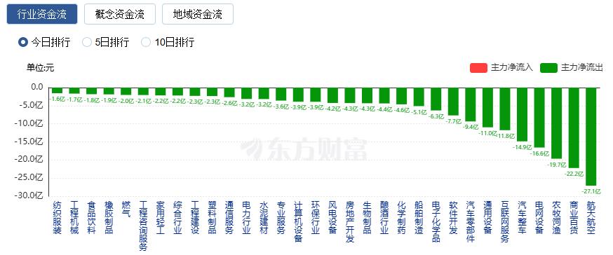 净流出方面,航天航空、商业百货、农牧饲渔等净流出排名靠前,其中航天航空净流出27.11亿元。