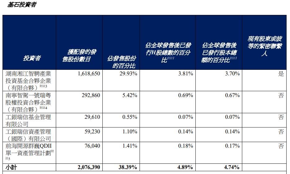 希迪智驾的基石投资者是湖南湘江智骋产业投资基金合伙企业(有限合伙)、南宁智驾一号瑞粤股权投资合伙企业(有限合伙)、工银瑞信基金管理有限公司、工银瑞信资产管理(国际)有限公司、前海开源群巍QDII单一资产管理计划。