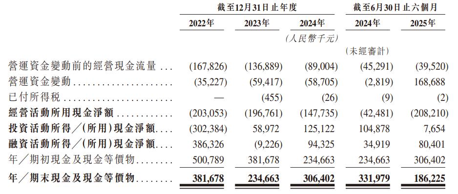 2022年、2023年、2024年、2025年上半年,希迪智驾经营活动所用现金净额分别为2.03亿元、1.97亿元、1.48亿元、2.08亿元。