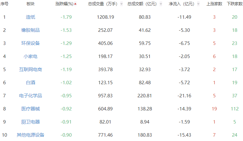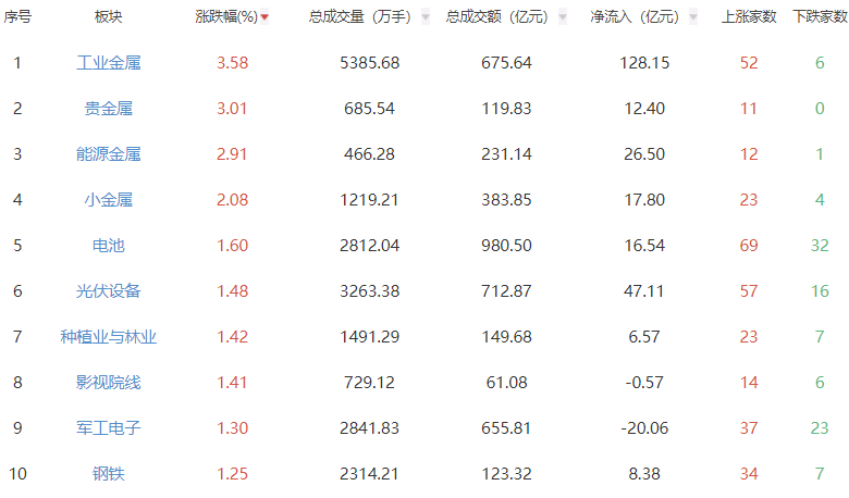 板块方面,工业金属、贵金属、能源金属等涨幅居前,造纸、橡胶制品、环保设备等跌幅居前。